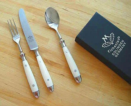 Das historische Eichenlaub Backenbesteck existiert bereits seit Ende des 19. Jahrhunderts und besticht nach wie vor durch sein zeitloses Design und die besondere Form. Das klare Design der Backen-Bestecke – stahlumrahmte Griffschalen mit zwei kleinen Nieten – wurde 1910 von August Merten, dem Gründer der Marke Eichenlaub, erstmalig zur Serie gebracht.
