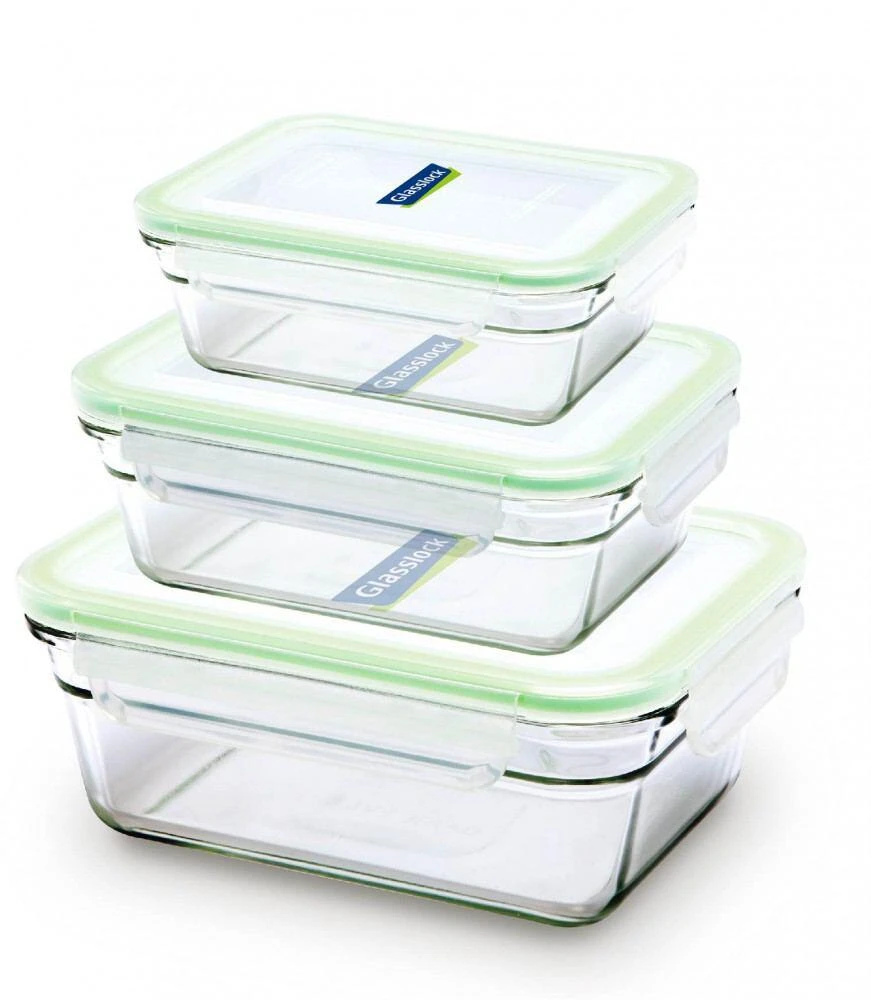 Glasslock-Set bestehend aus Frischhaltebehälter mit dem Fassungsvermögen von jeweils 480 ml, 970 ml und 1730 ml.