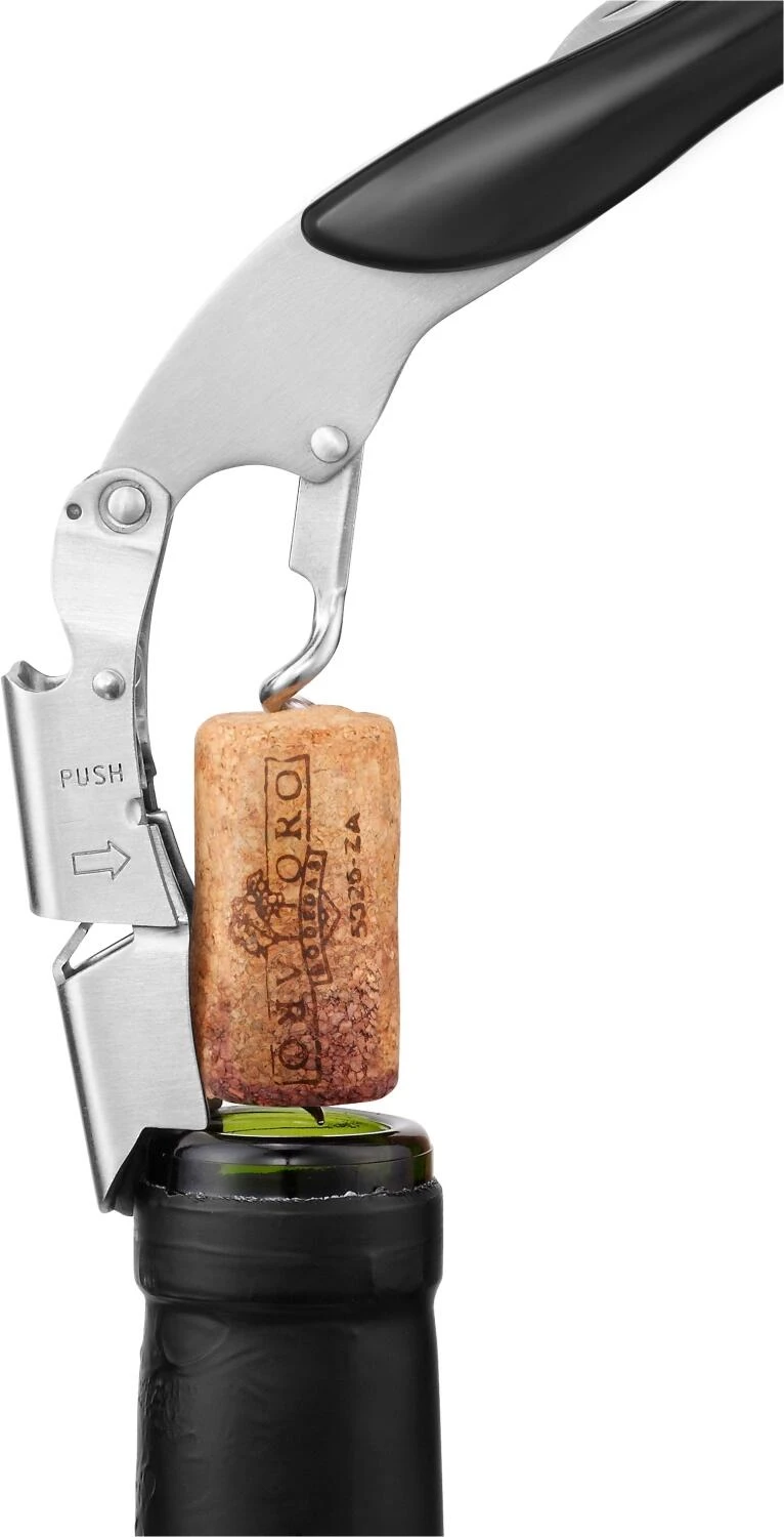 Gehört zur Grundausstattung: Hochwertiger Korkenzieher für zuhause und unterwegs. Das Kellnermesser arbeitet mit patentiertem 2-Step-System. Step one: Aufklappen, Spirale eindrehen, oberen Teil aufsetzen, eindrücken und den Korken zur Hälfte heraushebeln. Step two: den Griff absenken, unteren Teil aufsetzen und den Korken komplett ziehen. Mit der Push-Funktion wird außerdem ein Abrutschen vom Flaschenrand verhindert. Ein unentbehrliches Utensil sowohl für Zuhause als auch für die spontane Verkostung unterwegs.