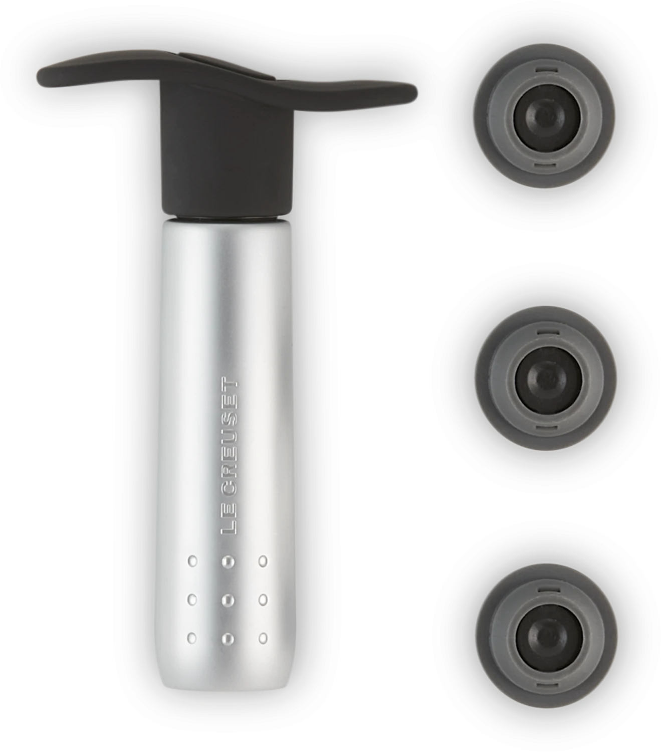 Le Creuset Screwpull Weinpumpe WA-137 mit Softgriff in Metall können geöffnete Rotweinflaschen wieder aromadicht verschlossen werden. Sie verfügt über einen angenehmen Soft-Touch-Griff und 3 mitgelieferten Weinverschlüssen.