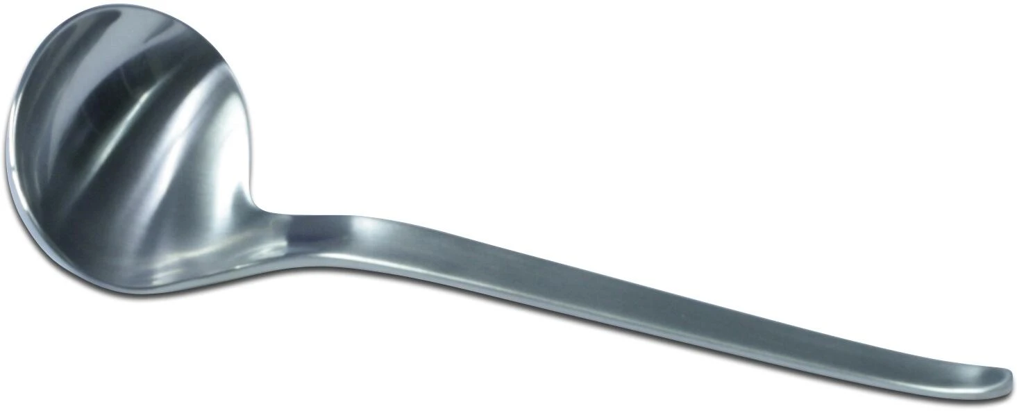 Saucenlöffel 22. Saucenlöffel aus matt gebürstetem Edelstahl 18/10 in auffälligem Design, das an die Natur und herabfallende Blätter erinnern soll.