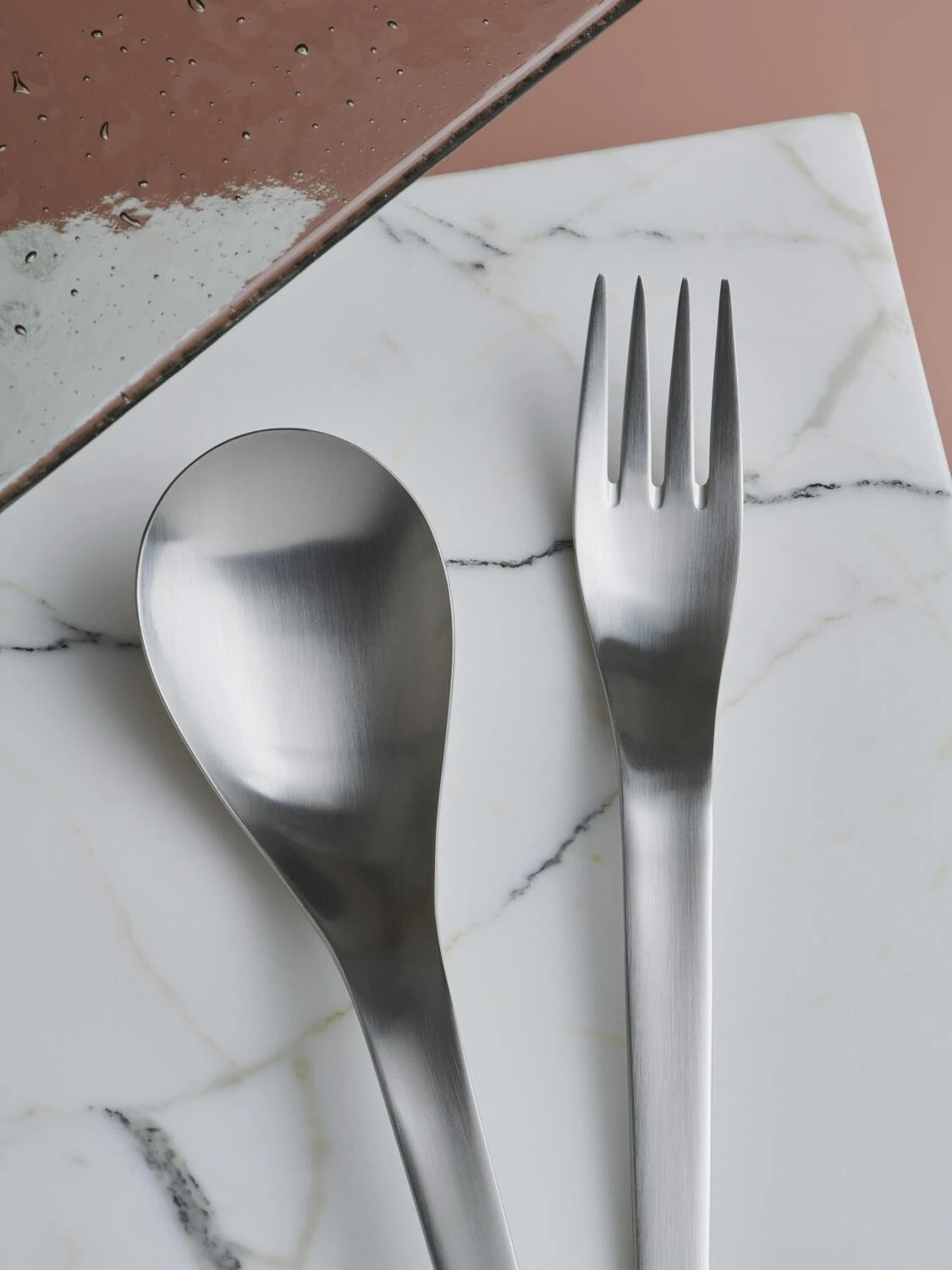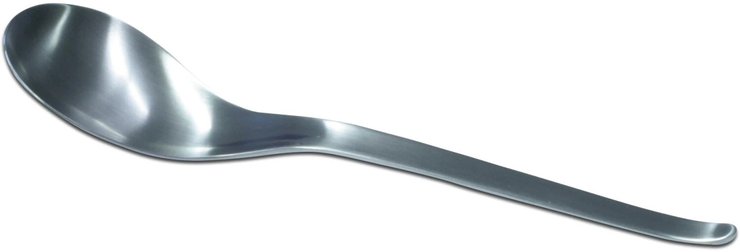 Pott Tafellöffel 22. Tafellöffel aus matt gebürstetem Edelstahl 18/10 in auffälligem Design, das an die Natur und herabfallende Blätter erinnern soll.