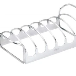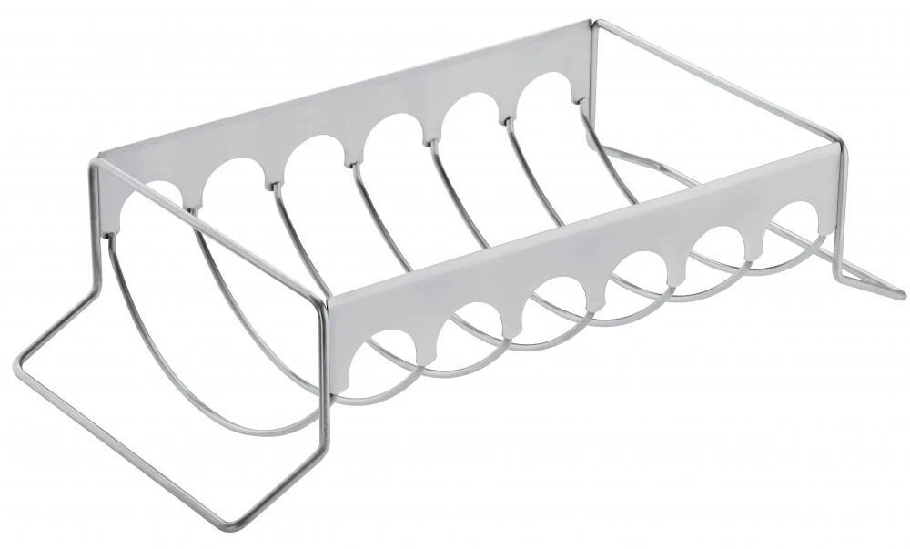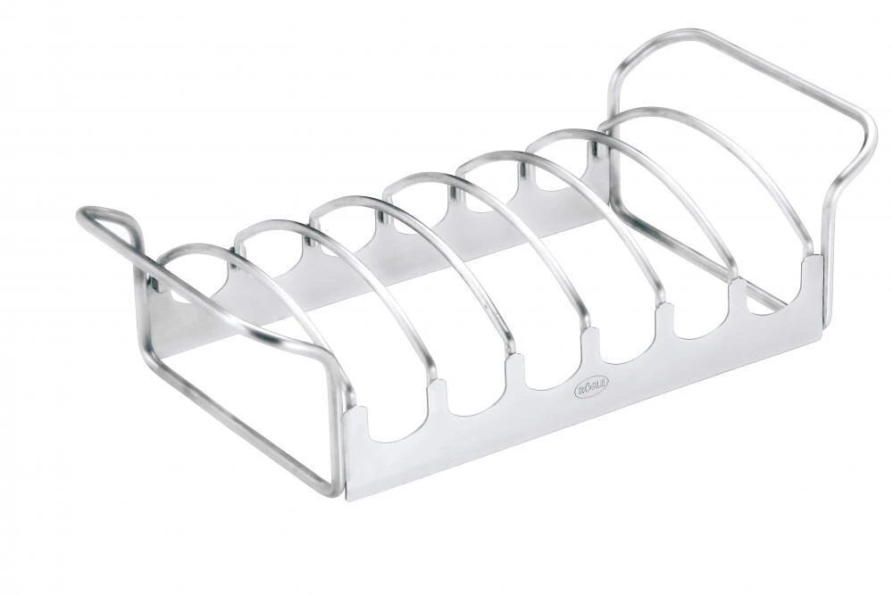 Der Rippchen- und Bratenhalter wird auf dem Grill verwendet. Aufgestellt dient das Grillelement als Halter für Rippchen und umgedreht als Bratenkorb. Im Bratenkorb kann ein Braten im Ganzen gut und sicher transportiert werden, was außerdem durch die praktischen seitlichen Griffe ermöglicht wird. Der Rippchen- und Bratenhalter ist passend für die