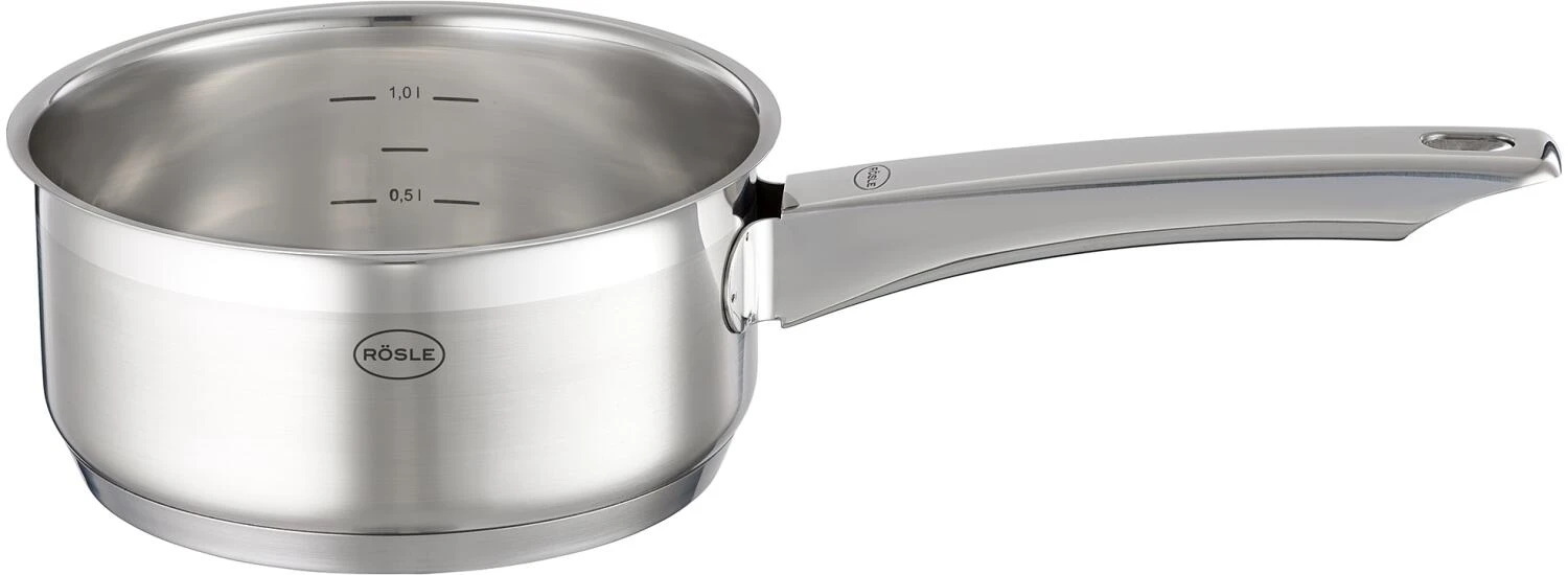 Die Rösle Stielkasserolle Charm garantiert komfortables Hantieren und angenehmes Kochen. Mit der Innenskalierung kann bequem der Inhalt überprüft werden. Die Stielkasserolle aus Edelstahl 18/10 ist hygienisch und geschmacksneutral. Der geschwungene Griff rundet das Bild ab.