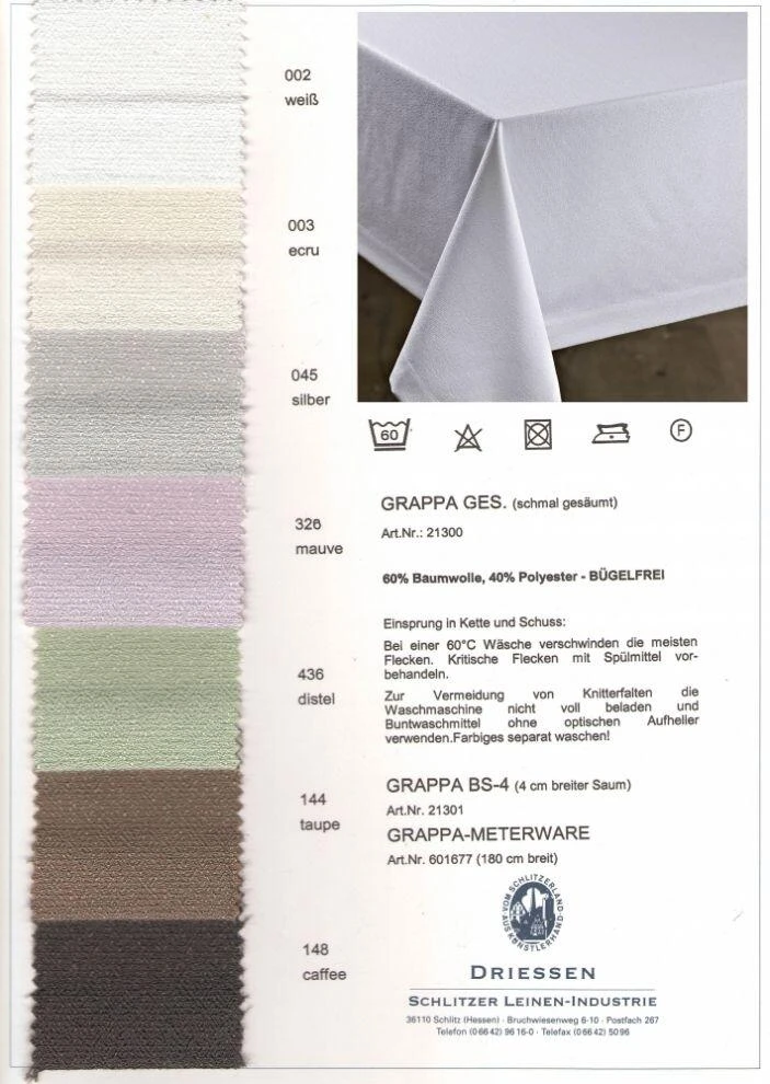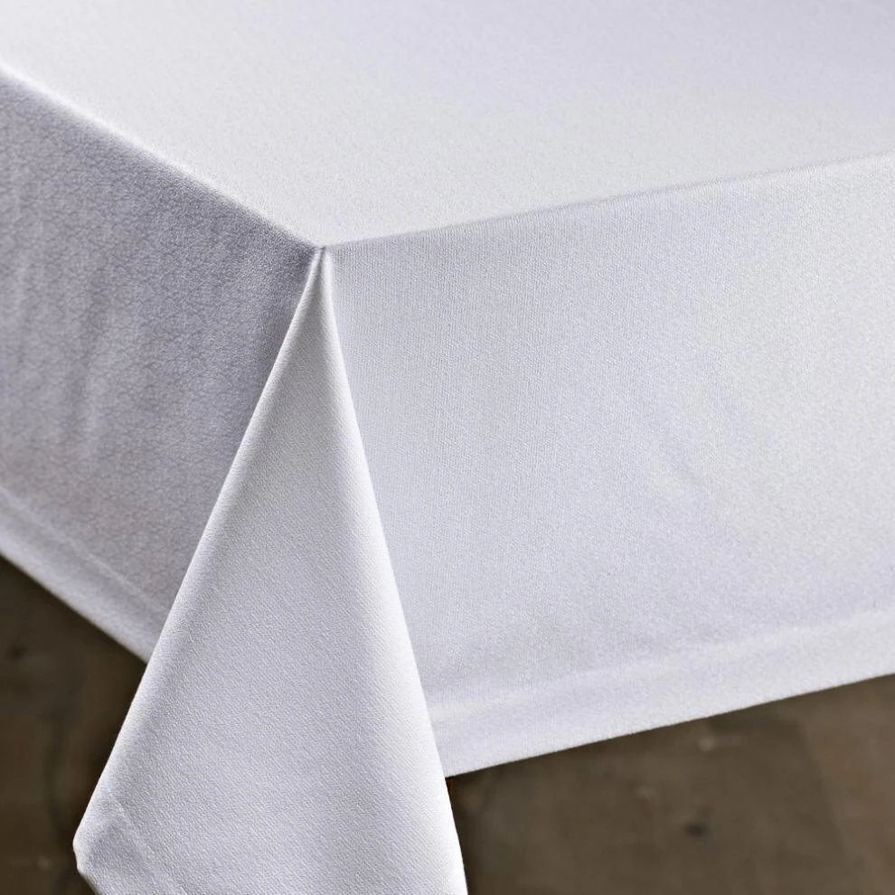 Tischdecke Grappa weiß. Aus 60% Baumwolle und 40% Polyester. Besonders pflegeleicht und bügelfrei.
