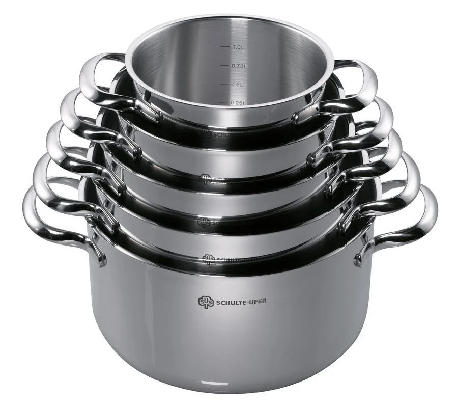 Schulte-Ufer Suppentopf Romana i. Der Design-Klassiker aus rostfreiem Edelstahl 18/10 in schwerer Ausführung mit induktionsgeeignetem protherm®-Kupferboden.