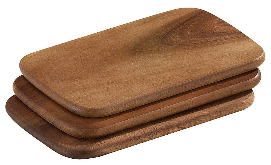 Frühstücksbrett aus Akazienholz, 3er-Set. Das Holz der Akazie ist besonders robust, belastbar und langlebig. Daher eignet es sich ideal als Arbeits- und Schneitunterlage in der Küche.